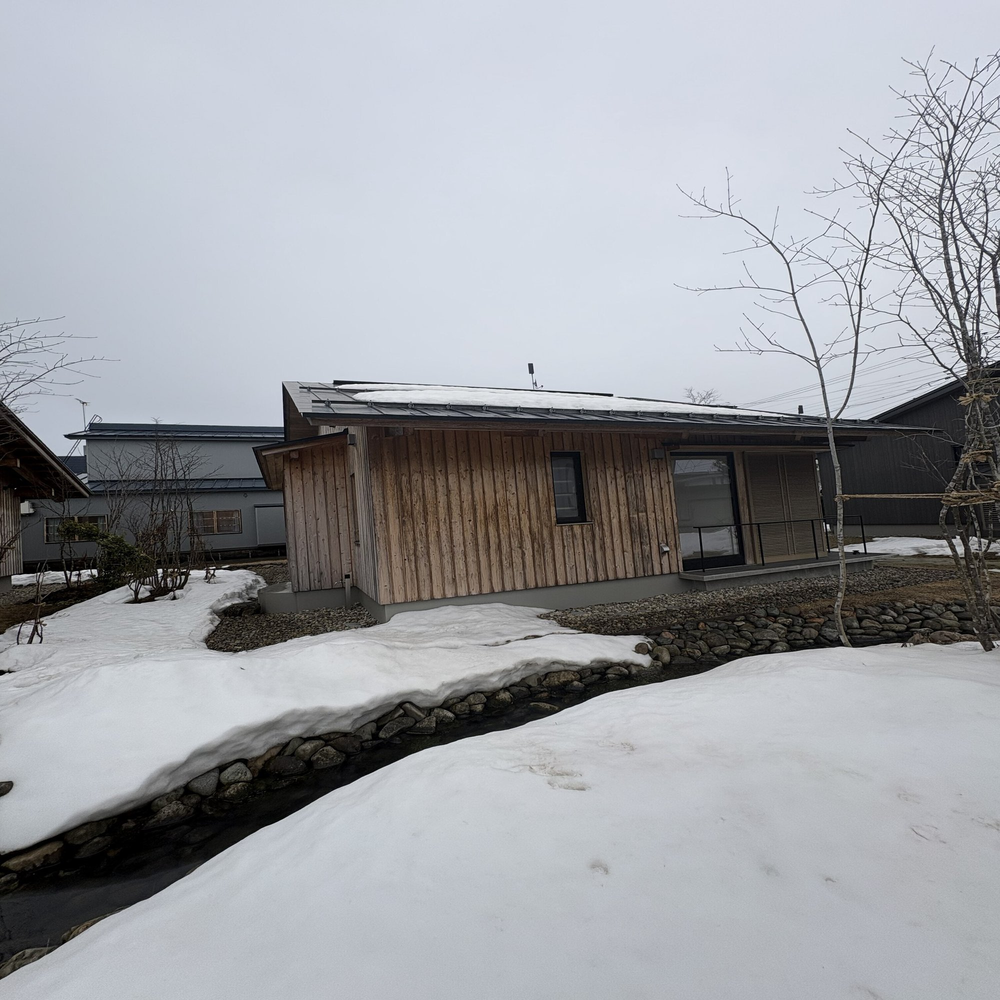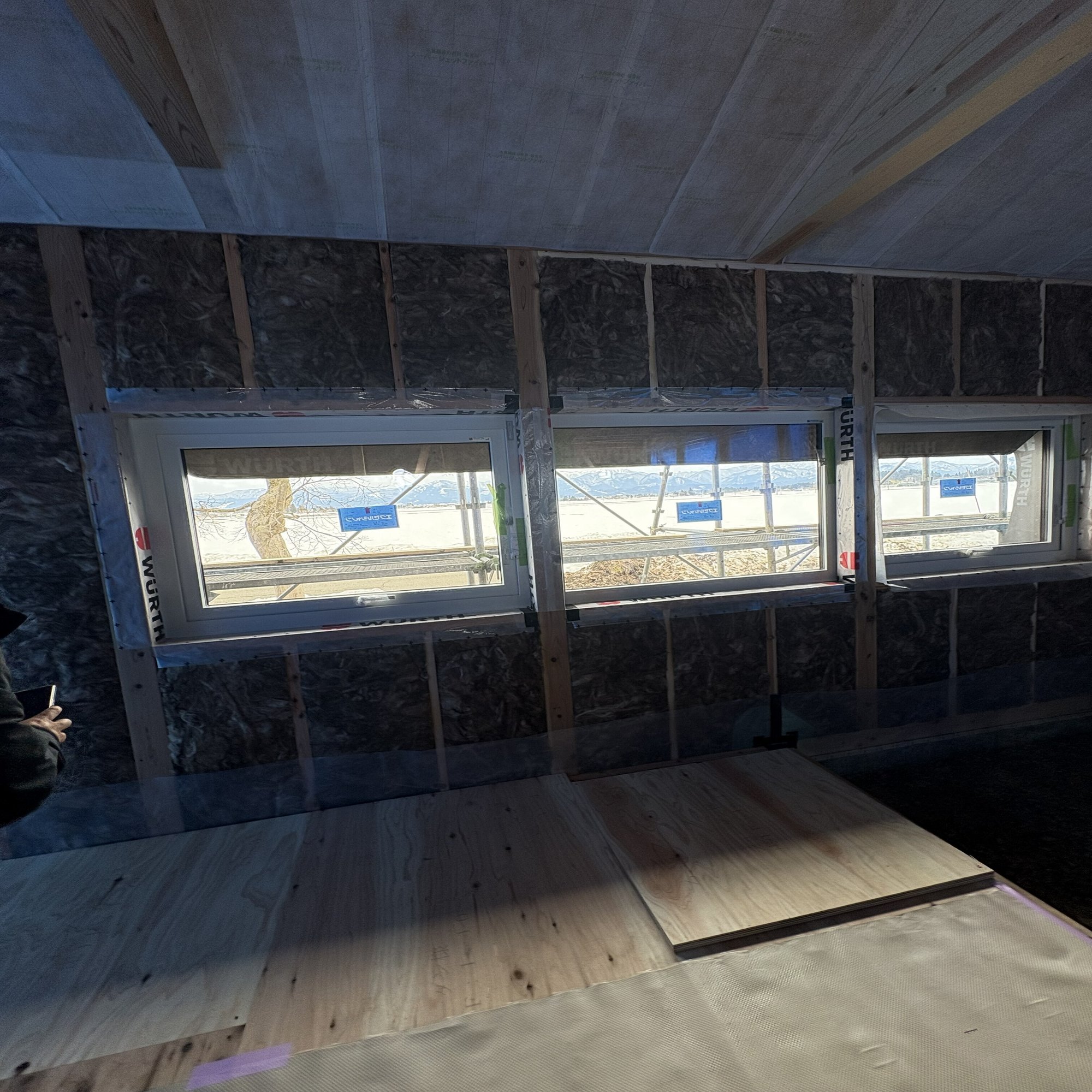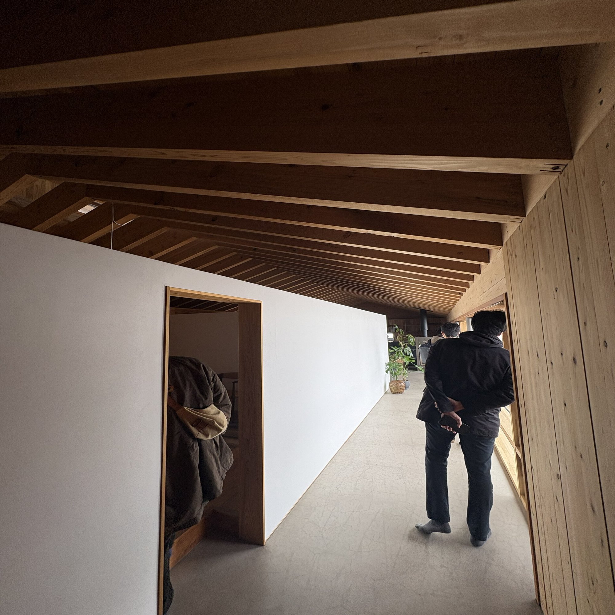 秋田に到着して最初に向かったのは、現在進行中の平屋の現場でした。延床面積30坪ほどのお宅ですが、足を踏み入れてまず驚いたのは、空間のゆとりです。日本の標準的な寸法(3尺=910mm)ではなく、4尺5寸(約1365mm)という少し広めのグリッドで設計されています。廊下の幅一つとっても、海外の方にも窮屈さを感じさせない工夫があり、サッシがきれいに納まる合理性も兼ね備えていました。